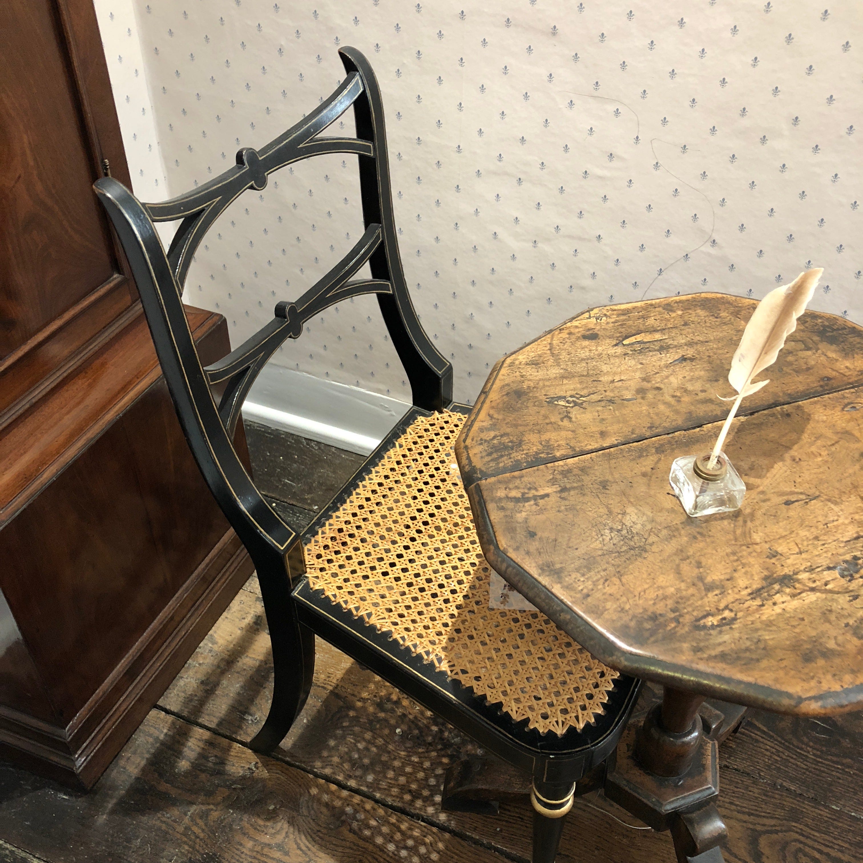 Jane’s writing table stands under a window in the dining room. It is a small, wobbly walnut table with tripod legs. I am a person whose chaos spreads over several tables and spills onto the floor and I can’t imagine how she was so contained. Her nephew James Edward Austen Leigh described in a memoir how she was adamant that no-one other than her close family should know that she was writing books, and that she wrote, “upon small sheets of paper which could easily be put away, or covered with a piece of blotting paper.” So not only did she write on a tiny table, she did so discreetly, suffering constant interruptions. She was very rarely alone, and as an unmarried woman, she was often expected to travel to the bedside of ailing aunts or cousins in confinement, who required her services. Even when home, she shared a bedroom with Cassandra. But somehow, in those eight years, she completed Sense and Sensibility, Pride and Prejudice, Mansfield Park, Emma, Northanger Abbey, and Persuasion. With home made ink.