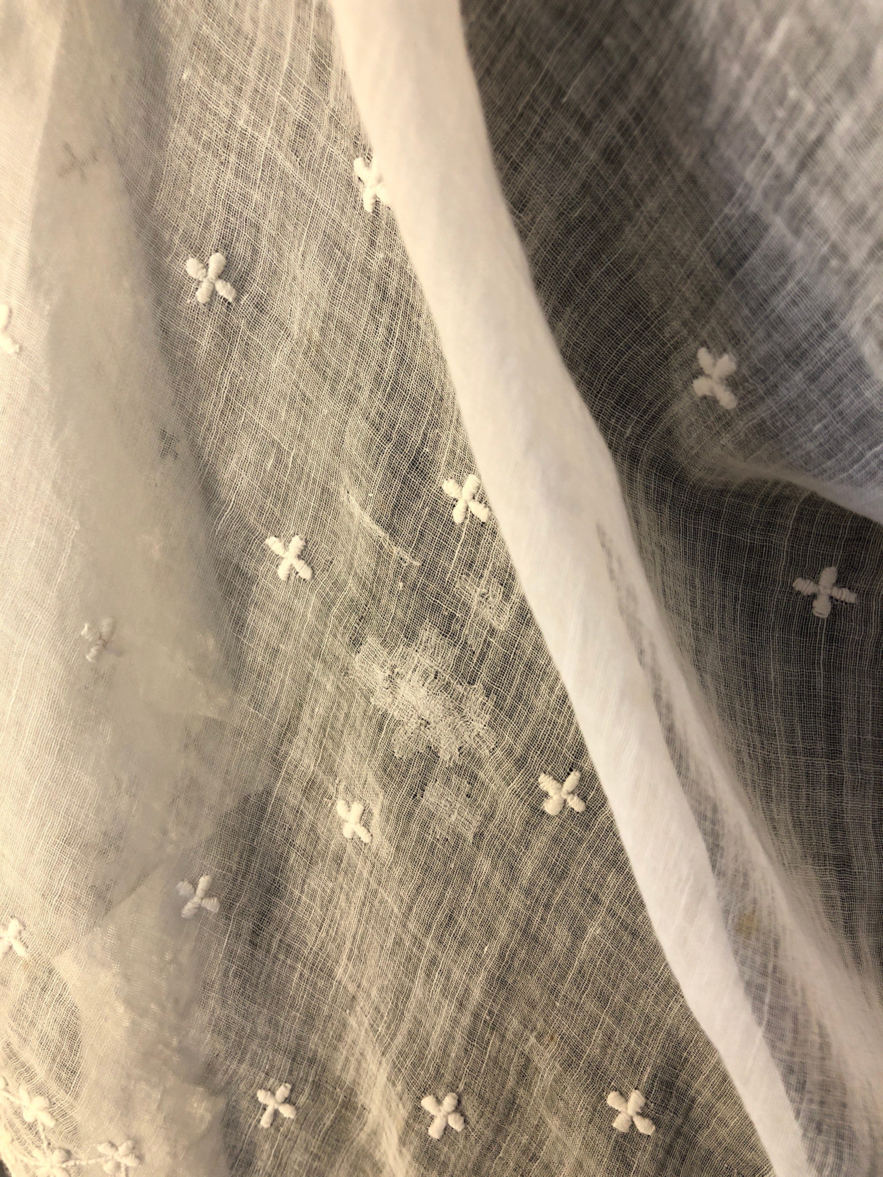 A white, embroidered shawl, believed to be Jane’s own work, delicate and fine, with endearing tiny darns.