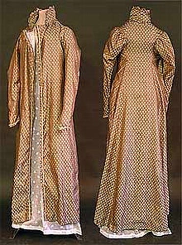A brown silk pelisse. A pelisse is kind of a coat and kind of a dress, worn long, with sleeves, sometimes cut away at the front to reveal another dress beneath, sometimes worn with a belt made of the same fabric. The pelisse on display in the house is a replica, made